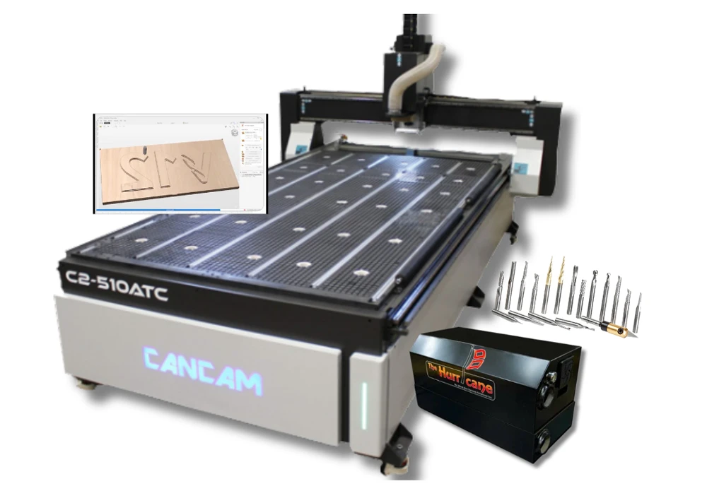 Unlike competitors who charge for upgraded components or add on accessories,CanCam has included a number of these as standard features such as pneumatic solenoid (Single phase machines) and electronic solenoid (3 phase) -actuated vacuum zones, a plug and play outlet for a rotary lathe with a spare servo driver, pop up location pins, easy sheet rollers, castors, a T-slot/vacuum combination table, helical rack and pinion motor mount, planetary gear vs. belt driven gantry , centralized lubrication along with two calibrators, one fixed and one mobile.