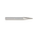For fine-line “engraving” in wood and composite materials, use either of these compact bits. Two-flute configuration and modest length (which minimizes vibration) combine to produce crisp, clean cuts.