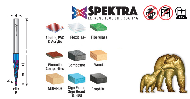 Our Spektra™ bits feature a nACo® nanocomposite coating with an extreme nanohardness and heat resistance. With a brilliant distinctively-tinted coloring nACo provides additional improvements in four critical aspects of router tooling.