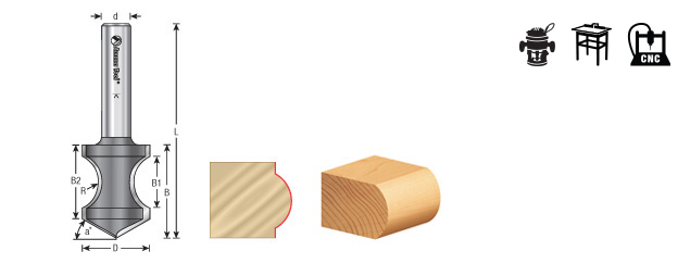 Intended for forming and edging internal hand-helds and cutouts in a single pass, this bit will also cut a soft bullnose on any exposed edge. Use in a CNC or other automatic router. Plunge cuts on router table are not recommended.