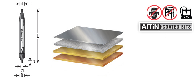 Countersinks drill downwards a small amount in order to make a quality starting hole and a profile. Follow up with a secondary drill for the full depth of cut of the work-piece. They don’t route along a slot. Combination drill/countersinks provides exceptional starting positioning for secondary drills, plus provide qualified countersink dimensions for screw heads, etc. Premium Aluminum Titanium Nitride (AlTiN) coating provides quantum increases in productivity, either in terms of speed or longevity, with or without coolant.