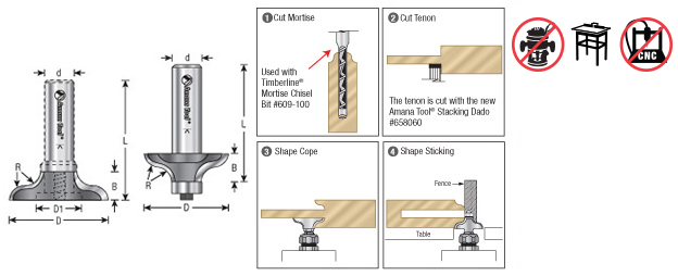 This unique door-making system utilizes a “stub” spindle & cope cutter arrangement. The counterbored cope cutter is secured to the spindle with a cap screw. A matching profile bit is used to shape the decorative ogee “sticking” along the edges of the stiles and rails. As the cope is cut on the ends of the rails, the tenon passes over the top of the bit unobstructed.
