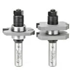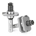 Cut perfectly fitted tongue-and-groove joints on stock between 1/2″ and 3/4″ thick with a table-mounted router and this assembly. The tool consists of an arbor with an integral shank, two identical, removable slotting cutters, and a pair of bearings. To cut tongues, sandwich one bearing between the two cutters (as in drawing A). To cut slots, mount one cutter between the two bearings (as in drawing B). Each set contains two complete tongue & groove assemblies, one to cut tongues, one to cut slots.