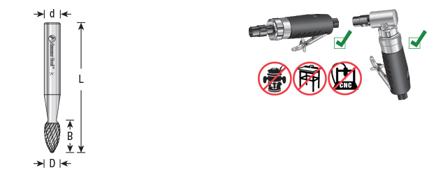 Benefits of the Double Cut (DC) flute include rapid removal of a broad range of materials combined with excellent operator control. It does this by incorporating a positive cutting rake angle that gives great “bite” into the material and yet, is not so aggressive that the operator fatigues quickly after using it in a hand piece. The steel shanks are ground, which sets them apart from our competitors. The solder joints are clean, with no excess solder gaping out from the sides between the carbide bud and the shankApplications:To be used with air or electrically driven hand die-grinder with a typical collet mechanism or knee mill with an air-driven spindle speeder such as an Air Turbine product. Use of a quality spindle speeder may greatly improve performance of miniature tooling.