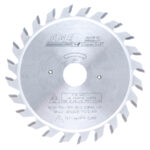 Used on vertical panel saws and sliding table saws with separate scoring units for chip-free cuts on both sides of the material. Adjustable scoring sets consist of two 12-tooth saw blades with shims to adjust the kerf width (2.8mm to 3.6mm). Used in combination with our plywood/laminate series triple chip blades only.